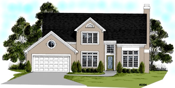 The attractive exterior of this home features a stucco finish and large windows with transoms. The 2,292 sq.ft. plan has 4 bedrooms and 2-1/2 baths. The luxurious master suite located on the first level includes a whirlpool tub, 3'x4' shower, and a large walk-in closet. Separating the dramatic open living room and family room is the stairway leading up to bedrooms 2, 3, and 4.