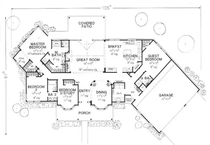 A guest/in-law suite is adjacent to the kitchen and garage for convenience. Cathedral ceilings are in the master suite and great room. Bedroom 3 is an optional study/office at the entry. Other popular features include a large country kitchen and a formal dining room. The two car garage is side entry.