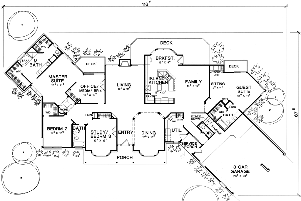This upscale country style single story home features a remote master suite with an office that can be an optional fifth bedroom. The guest/in-law suite adjacent to the kitchen includes a full bath, a kitchenette and a private deck. The family room can be served directly from the island kitchen serving counter. Other features are separate living and family rooms and a three car garage.