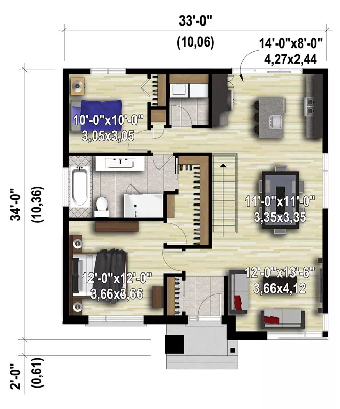 Affordable, narrow lot modern house plan featuring 1,081 s.f. with 2 bedrooms. The welcoming foyer is brightened by a sidelight and a transom window; a handy coat closet accepts your visitors' jackets. The island kitchen flows into the dining area and the living room, promoting gracious hospitality. Note the corner window arrangement in the living room. The master bedroom boasts a walk-in closet and direct access to the spacious full bath.