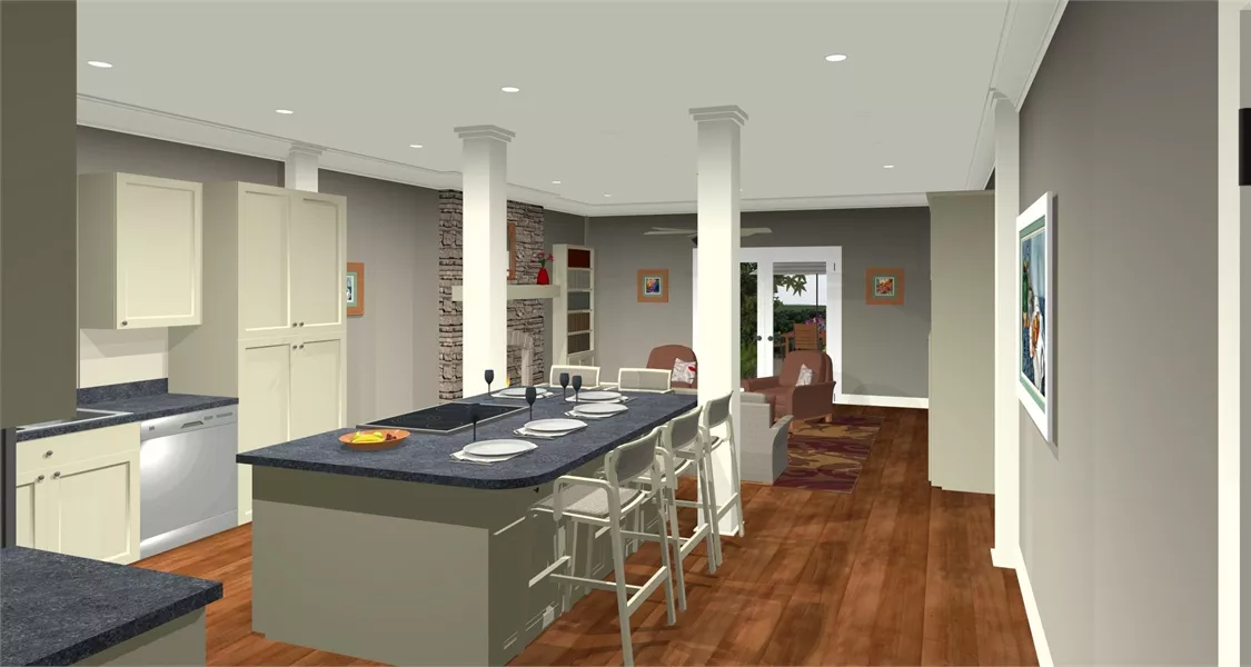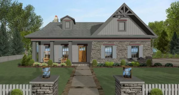 Stone accents and nostalgic shutters adorn this one-story cottage house plan, with four bedrooms, two baths and an affordable 1,499 square feet of living area. The spacious family room in this home plan benefits from a fireplace and patio access. The open kitchen incorporates snack seating for five. Double doors introduce the posh master bedroom, with its walk-in closet. The private bath boasts a separate tub and shower, along with a single vanity. Two children's bedrooms in this home design make use of a full bath. Our customers love the fourth bedroom, which could serve as a dining room or a home office. Don't overlook the charming front porch.