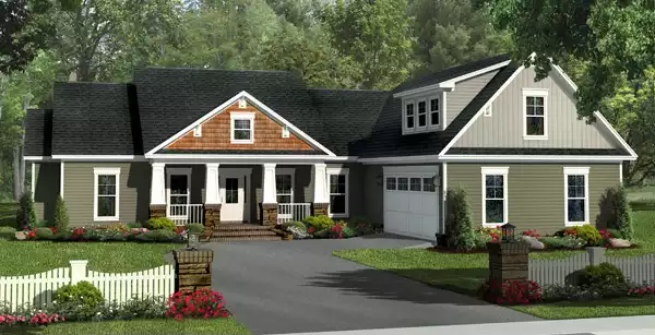 This inviting Craftsman home is packed with great features. The front and rear covered porches add plenty of usable outdoor living space. Expansive great room includes a beautiful trayed ceiling as well as built-in cabinets and a gas fireplace. The spacious kitchen features an oversized island with a large eating bar and breakfast area. The hall bath is equipped with dual lavatories for convenience. The master bedroom has a raised ceiling and opens into the well-equipped bath with dual lavatories, oversized corner jet tub, and large his and her walk-in closets. There is a workshop area off the garage for projects and storage. The media/hobby space is perfect for a home office. There is also a full basement option that could be used for additional storage or future expansion. This is a very flexible home with plenty of options to choose from. Make this your family's next home!