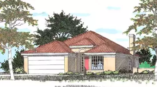 This two bedroom stucco mediterranean style home was designed to be a retirement home on a narrow lot.