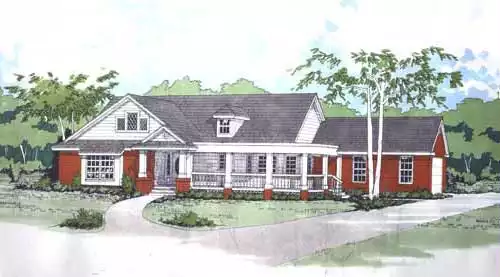 This country style home features a wraparound front porch and a garden room at the rear. The country kitchen has a corner dining area with many windows. Construction drawings are included for an optional bonus room in the attic. The garage is side entry.