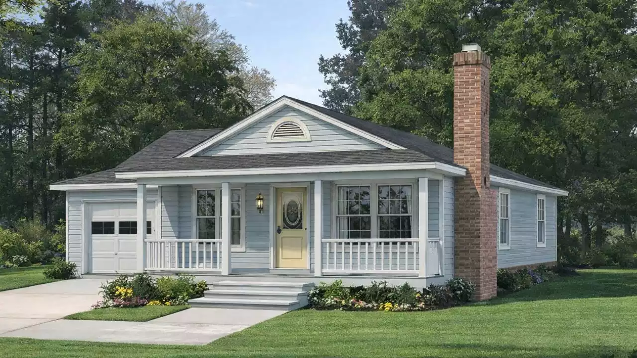 This delightful 1,050 sq. ft. plan is designed as a "starter" home or "empty-nester". It also lends itself well to a vacation atmosphere. A vaulted ceiling gives an airy feeling to the dining and living area. The streamline 9'x11' kitchen has a comfortable work triangle. A cozy fireplace makes the living area really feel like home. A master suite, measuring 11'x12' has a large closet, a French door leading onto a patio and a spacious master bath. The two remaining bedrooms share a hall bath. The washer and dryer are tucked conveniently in a laundry closet.