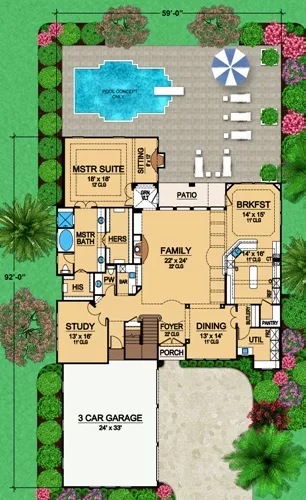 Feel right at home as you walk into this stunning luxury house plan. The two-story foyer is flanked by the quiet study and formal dining room with its large decorative pillars that define its perimeters. The dining room provides direct access to the butlery, utility room, and kitchen for ease in serving. The family gathering area consists of the kitchen, breakfast area and family room. The center warming fireplace helps keep this area cozy. Access to the patio can be achieved through the breakfast area. The gourmet kitchen provides a free-standing island for additional counter space. The breakfast bar can be shared with the family room and breakfast area. Through the groin vault ceiling, you will enter the luxurious master suite boasting sitting area with a warming fireplace, trey ceiling, lavish master bath with his and hers vanities, separate shower, tub, and large wardrobe. Upstairs, two family bedrooms offer walk-in closets, full baths, and share space with the game room with loggia, bar and balcony and large bonus room. Enjoy the views from above to the lower level. This completes this luxury house plan.