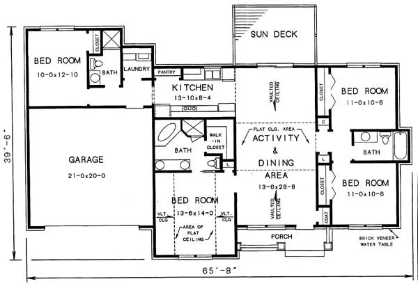 Well-placed rooms keep halls to a minimum and allow the most practical use of interior space. The casual atmosphere of a sheltering front porch allows entry into the central element of the home, the gathering room, which is both activity room and dining area. A vaulted ceiling adds just the right touch and sliding glass doors lead to a rear sun deck, offering a view of nature. Two bedrooms comprise one wing of the home, each sized for comfort and conveniently placed central to a full hall bath. A brilliant window treatment captures the sun's rays into the tall vaulted ceiling of the master bedroom. Dramatic impressions are created in the elegantly appointed garden bath, with corner tub, double vanity and separate shower. A large walk-in closet is indicated. The activity room easily accesses the corridor style kitchen. A huge pantry is placed for convenience. Nearby is the laundry room and access to a double garage. A multi-purpose "extra" bedroom is behind the garage, creating luxurious privacy. This room could be an in-law suite, home office or guest bedroom. The possibilities are limitless. Simple multiple gable rooflines and a combination of horizontal siding and brick enhance the exterior of the home.