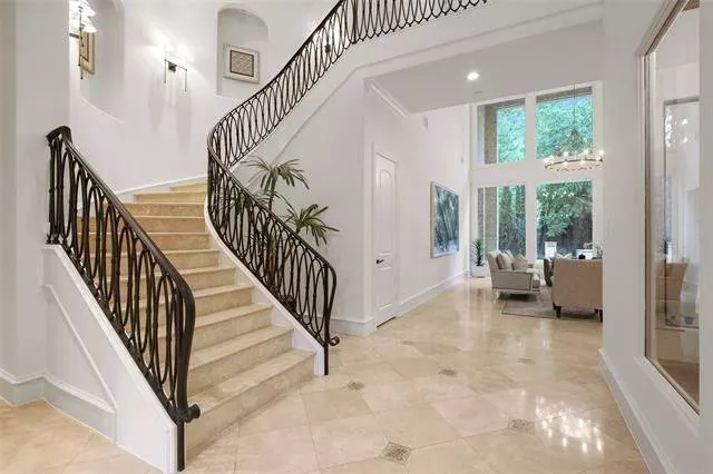 wrought iron staircase that leads you to the second story of this luxury floor plan. On either side