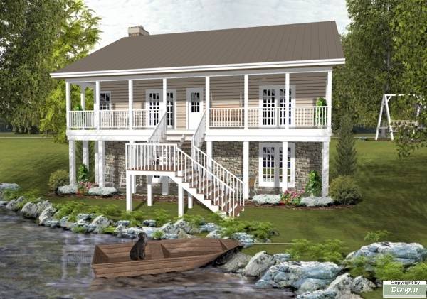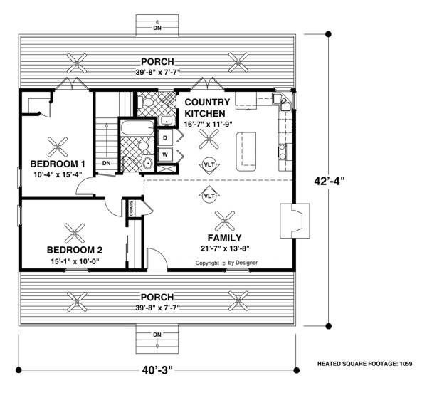 An updated version of our ever-popular House Plan 6746, this cottage was expanded slightly to allow a basement foundation. You'll still find the irresistible rocking chair porches of this cozy retreat. Its two large bedrooms feature oversized closets and convenient access to the hall bath. A vaulted ceiling provides a spacious canopy for the open kitchen and family room with a warm and inviting fireplace. This compact home has everything you?ll need to enjoy a vacation getaway. The kitchen has a sunny corner double sink and roomy center island /snack bar. Just off the kitchen are a convenient laundry center and a powder room with direct access from outside. The full basement allows plenty of space for expansion or storage.
