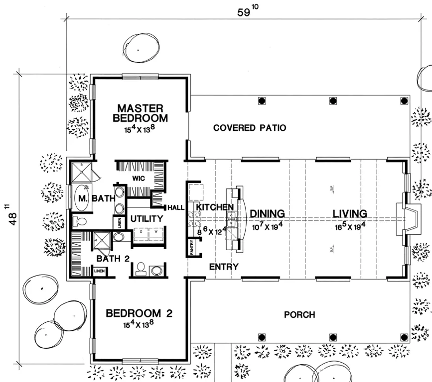 This picturesque cottage style plan is a charmer from the moment you walk up. Modeled after a country Craftsman home, this plan offers 1,588 square feet of living space as well as 2 bedrooms and 2 bathrooms, making it perfect for a newlywed couple or first time home buyers. This single story home provides a detached garage for sheltered parking, as well as expansive covered front and back porches that protect from the elements. A beautiful front entryway opens on to the gourmet kitchen that is an entertainer’s dream. The large island and open layout on to the dining and living room makes this space have a natural flow, while the vaulted ceilings make the space feel even bigger than it is. Behind the kitchen you will find this home’s 2 bedrooms; the master suite and a secondary bedroom that would work great as an office or nursery, or even a guest space. Both bedrooms feature private attached bathrooms as well as large walk-in closets, giving this home a great amount of storage as you begin to make and accumulate mementos and memories.