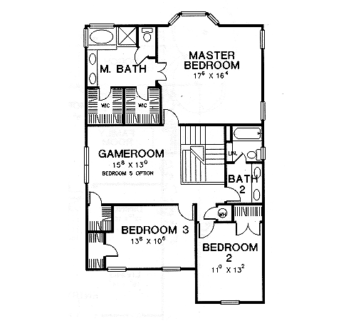 This two story country style home has all bedrooms upstairs. The ground floor study is an optional fourth bedroom. The upstairs gameroom is an optional fifth bedroom. A detached 2-car garage plan is included.