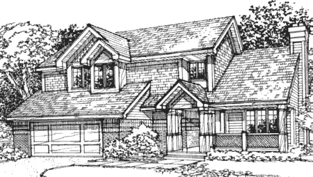 Exterior boasts multiple gables and covered front porch with lattice. Interior offers vaulted ceilings in living and dining rooms. Three bedrooms and two full baths upstairs include master suite with walk-in closet.