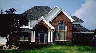 This traditional style two story home features aa arched porch and columns. The high ceiling library's windows add an elegant touch to the facade. The master suite is located on the first floor and includes a bayed sitting area. The upstair three bedrooms and media room can be reached using a separate back stairway.