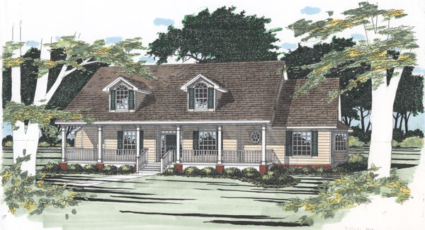 A large columned front porch and roof dormers add to the charming character of this five bedroom country style home. The master suite and two bedrooms are on the first floor and the second floor includes two bedrooms and a loft. Other features are an island kitchen and a utility/mudroom. The rear garage is side entry.