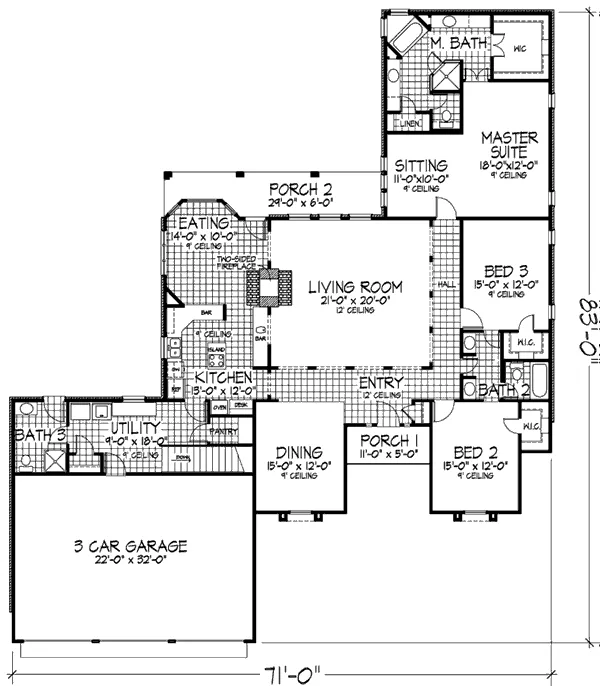 An open floor plan and beautiful adornments promise comfortable living within this appealing one-story. Beyond the sidelighted entry, the massive living room is bordered on two sides by exotic arched openings. A high ceiling rises over the entry and the living room, while the focal point at eye level is a rustic, two-sided fireplace with a brick hearth. The formal dining room is efficiently served from the spacious kitchen, which boasts an island cooktop, a nifty serving bar and a refreshing wet bar that is open to the living room.