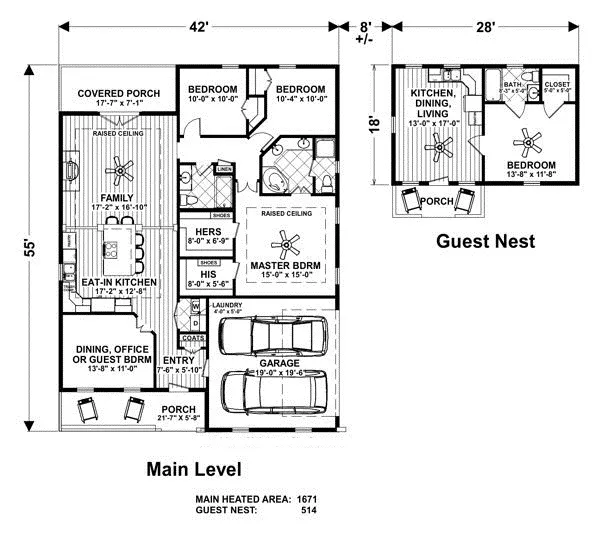 Gable details and tapered columns add appeal to this Craftsman style house plan, with four bedrooms, two baths and an affordable 1,671 square feet of living area. A separate guest nest with 514 square feet is perfect for adult children or aging relatives. A fireplace warms the family room in this home plan, which opens to a rear porch. The eat-in kitchen features snack space for five. His-and-hers walk-in closets are highlights in the posh master bedroom of this home design. The private bath boasts a whirlpool tub, a separate shower and two sinks. Builders point out the versatility of the front bedroom, which could be used as a dining room or a home office. Don't forget the front porch and the guest nest.