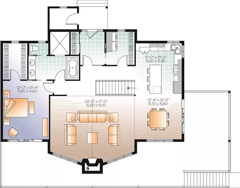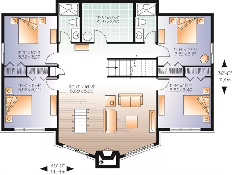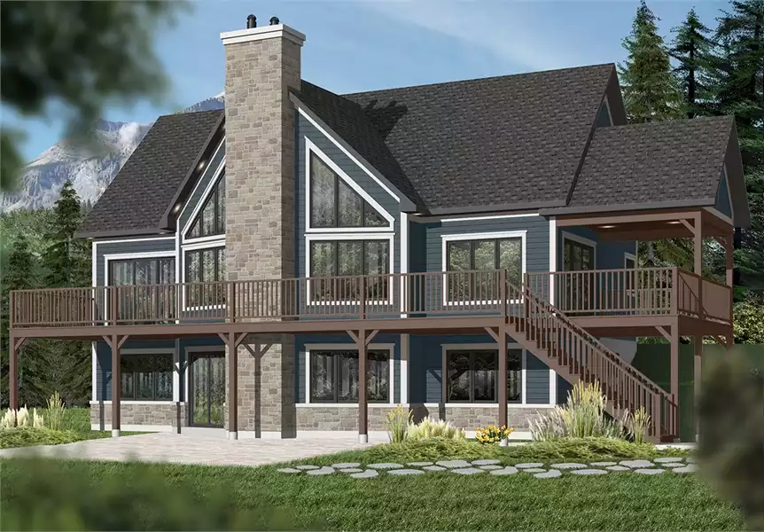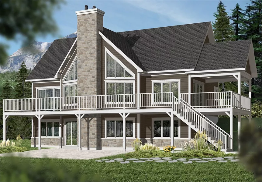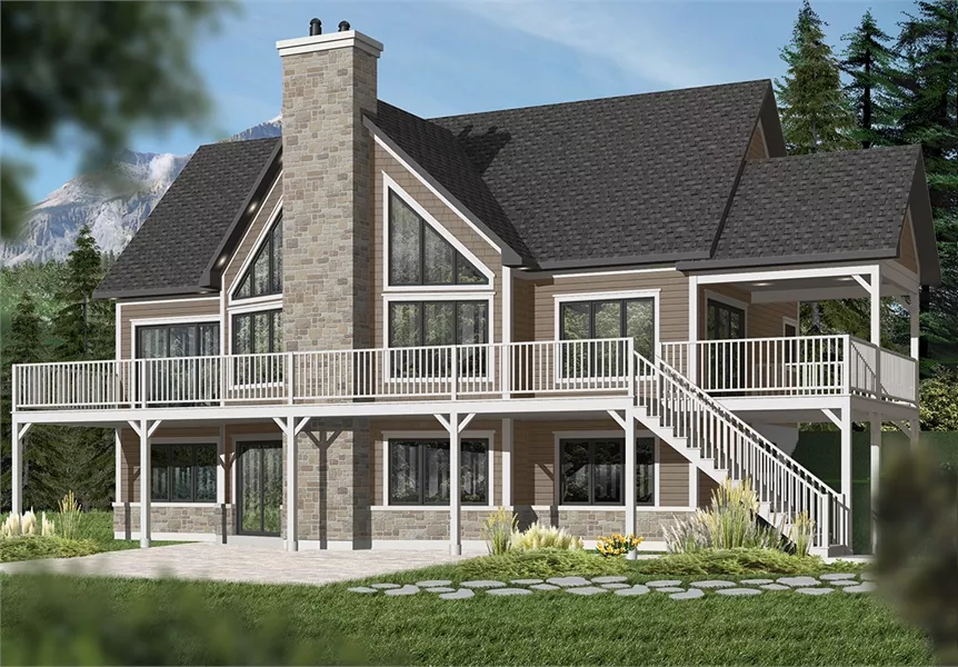 This beautiful five-bedroom, 2,958 square foot lakefront cottage house plan features a reverse living floor plan to maximize the view. The focal point of the main floor is a family room with soaring vaulted ceiling and fireplace that opens to the L-shaped kitchen with island seating and dining area.  The left wing features a private master suite. The entire backside of the home is adorned with a massive wraparound porch and large windows. The lower level is where you’ll find 4 more bedrooms, as well as 2 full bathrooms, and even a common area, great for a media room or play space for the little ones. Sliding glass doors lead out to the back yard and a fireplace make this level extremely inviting and comfortable all year long.