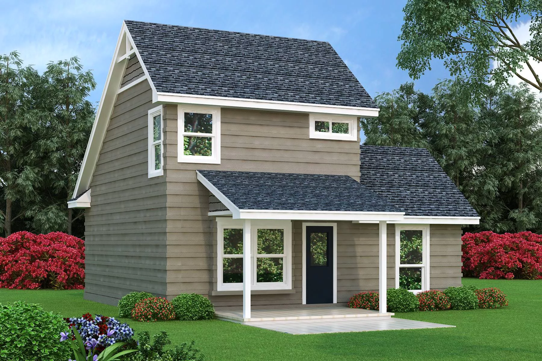 Are you looking for a neat home for a budget? House Plan 1955 would make a great choice if you only need two bedrooms! This 883-square-foot cottage has a good layout for household privacy because it has split bedrooms on two stories. When you enter the front door, you'll find the living space up front and the eat-in kitchen in back. The main-level bedroom and bathroom are off on the side, which allows you to get a cathedral ceiling in the sleeping space! Head upstairs to find the second bedroom and bath. House Plan 1955 has a compact shape, so it'll fit on most lots with ease!