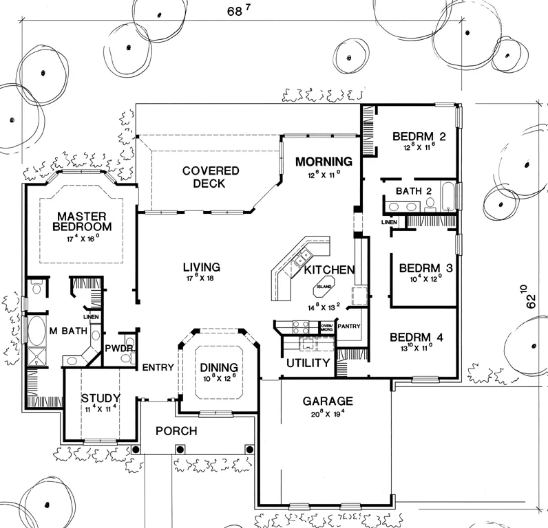 The Study behind French doors is tucked away in the Master Bedroom wing of the home. The Master Bedroom itself is very spacious with a bay window, tray ceilings and direct access to the Covered Deck. The Master Bath is elegant with angled vanity and His and Hers walk-in closets. The Kids Bedroom wing is efficiently laid out for a growing family.