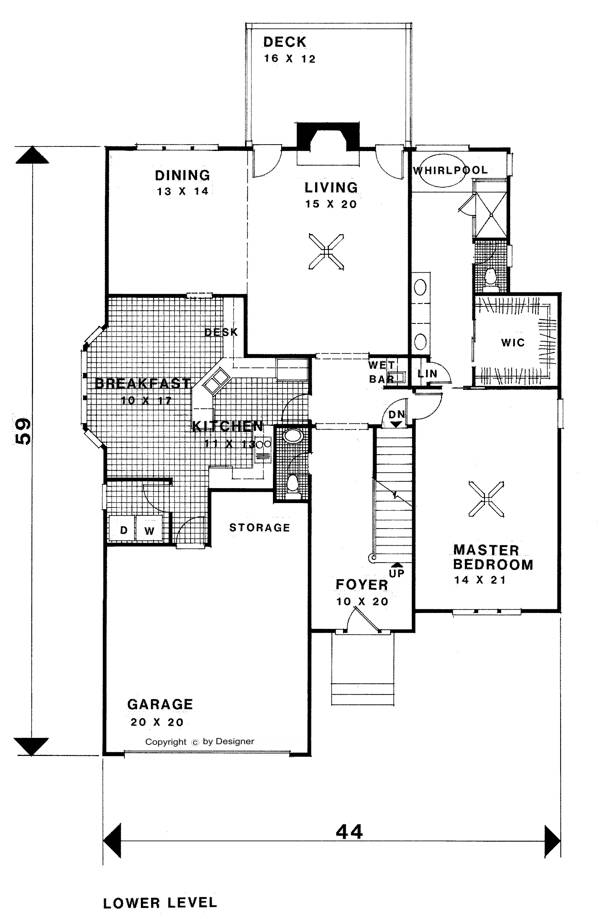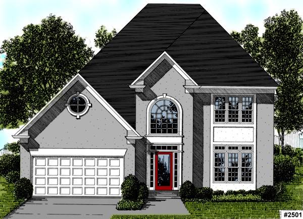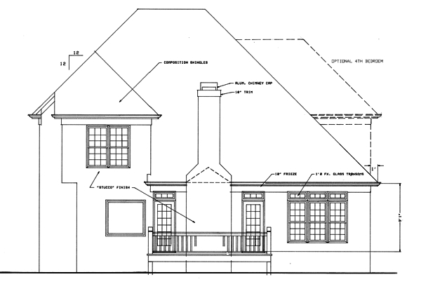 This 2,580 sq.ft. European traditional plan features a stucco elevation. The dramatic two-story foyer has a large upper level radius top window. The open kitchen and breakfast area features a bay window and built-in desk. The 13'x14' dining room is open to the two-story living room which features a fireplace and two doors opening onto the 16'x12' deck. A built-in wet bar is located outside of the living room. The large master suite pampers the owner with a whirlpool tub, shower, double vanity, linen closet and large walk-in closet. The upper level balcony overlooks the living room. Bedroom #2, measuring 14'x13', and bedroom #3, measuring 11'x14', each have walk-in closets, dressing areas with vanities and they share a private bath which includes a large linen closet. The optional fourth bedroom measures 13'x15' and features two closets and a private bath. This plan is ideal for narrow lots, measuring only 44' wide and 59' deep.