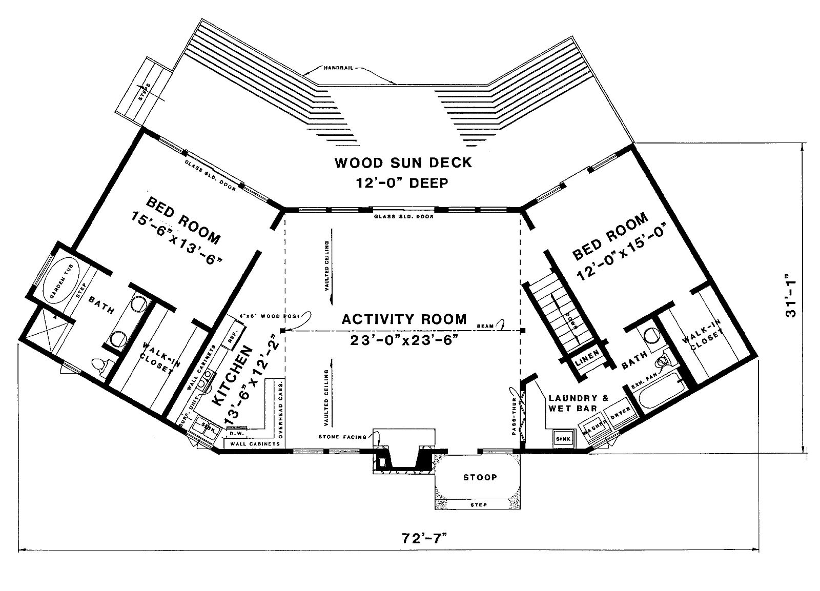 If you have property with a spectacular view to the rear, this is the plan for you. All of the main rooms look to the rear through virtually a complete wall of glass. Entrance is from the opposite side, and it introduces you to the sensational activity room that includes a vaulted ceiling and a stone fireplace. Glass sliding doors are flanked by windows, bringing your view into the room with you. The U-shaped kitchen is tucked away in one corner and includes all of the amenities. On the opposite corner is the laundry and wet bar area. Also included in this area is a linen closet and access to one of the bathrooms. There are two bedrooms on opposite sides of the home. The master suite includes access to the large sun deck and an extremely large walk-in closet. A garden bath with oversized tub, separate shower stall and vanity with double sinks provides a feeling of luxury for the homeowner. The other bedroom includes access to the sun deck, another large walk-in closet and a private bath. The contemporary styling is accentuated by vertical siding and a hip roof with extended ridge.