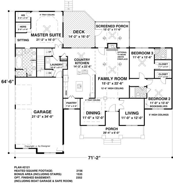 Relax in the luxurious master suite which includes a tray ceiling, a sitting area, his and hers walk-in closets, and exquisite bath. The 14'-3" x 22'-6" country kitchen, with a walk-in pantry, is open to the vaulted family room. A French door leads to the vaulted screened porch. The deck is accessible from both the screened porch and master bedroom. A decorative square column and tray ceiling adorn the elegant dining room. Bedrooms two and three each feature walk-in closets and individual baths. Tucked behind the functional laundry room are stairs accessing the optional basement and future bonus area.