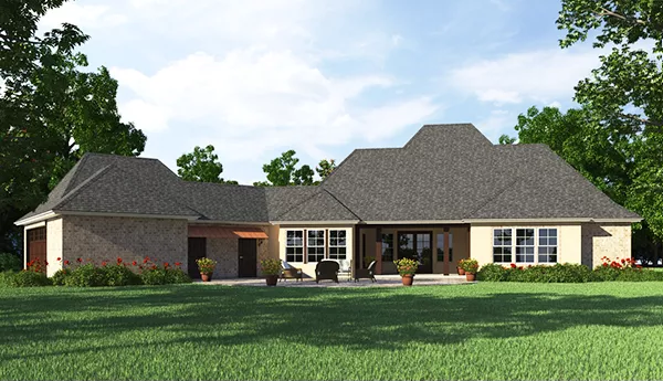 An open floor plan welcomes you into this spacious one-story home design. High 10-, 11- and 12-ft. ceilings enhance the spaciousness of the home. The deluxe master suite includes dual lavatories, a spa tub with a decorative glass allowing light in from the master bedroom's triple windows, a 4-ft. shower and a grand size walk-in closet.