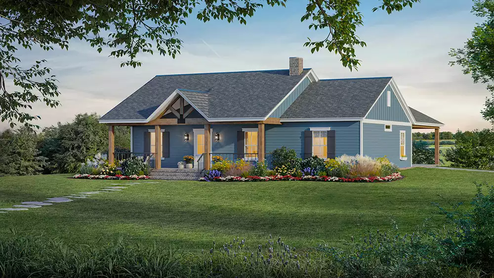 Like your own charming bit of fairytale paradise, one could imagine this lovely plan tucked away on some private acreage, surrounded by natural beauty. A subtle yet striking style encompasses the facade, offering a unique twist on a cottage home with some modern farmhouse flairs. Inside, an open and airy 1,428 square feet of space provides the open layout of this sensible beauty. As you move throughout the home, notice how the ample natural light brightens up each room, making it feel cozy yet spacious at the same time. The living room with its cathedral ceilings is a great place to soak this all in. From there, explore the eat-in kitchen and covered porch nearby. Notice that this home also has an attached carport for added convenience. Moving back inside, you'll find the owner's suite tucked privately away on one end of the home, complete with an en-suite bath and walk-in closet. On the other end, the 2 auxiliary bedrooms find themselves in their own bit of privacy. Something both the kids and guests will love.