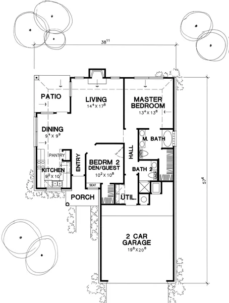 The columned front porch and arched windows enhance the traditional exterior styling. Vaulted ceilings in the master bedroom, dining and kitchen make this compact three bedroom, two bathroom home feel larger. A washer/dryer alcove is provided inside.