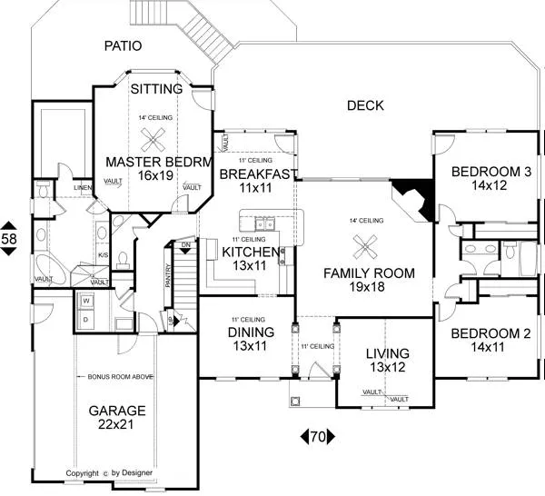 The master suite has been expanded and now includes a 14' high glass bay sitting area. Just off the luxurious master bath is an enormous 8'x10' walk-in closet. An abundance of windows brighten the breakfast room and kitchen. Vaulted and raised ceilings adorn the living, family room, dining, foyer, kitchen, breakfast, and master suite. The family room has also been expanded and now features a corner fireplace and 12' gliding patio door. The secondary bedrooms which measure apx. 14' x 12' and 14'x11' share a compartmentalized bath. The master bedroom, breakfast room, family room, and bedroom 3 all provide access to the full-width deck. A basement foundation is included with this plan.