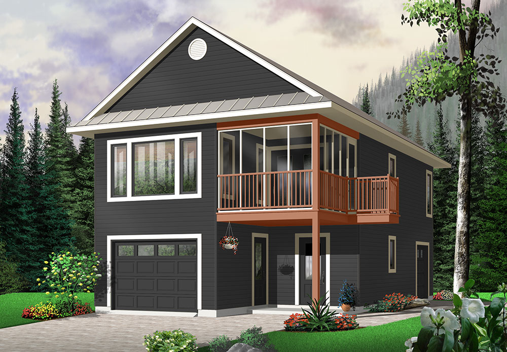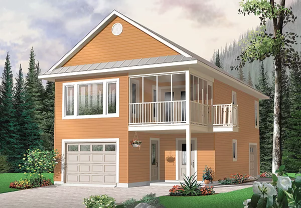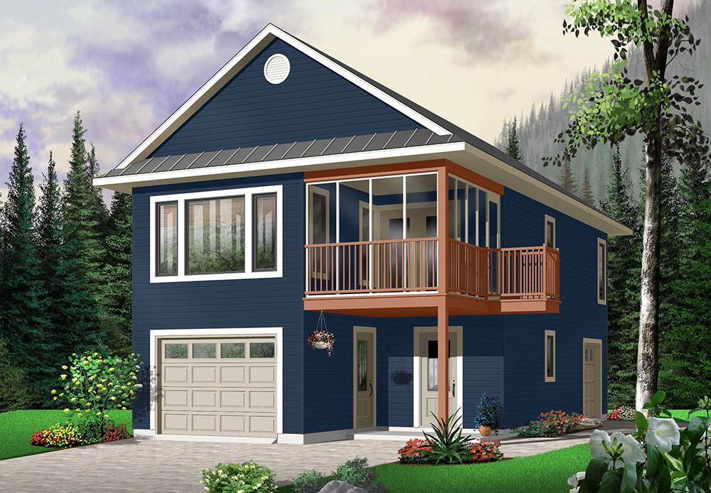 Much like the Murphy bed, our Murphy is a wondrous bit of efficiency and flexibility. A slender 24-foot width allows it to be slipped onto infill lots, into eco-communities or a larger lot as a charming guest house or mother-in-law suite with the added benefit of a two-car garage! The entry provides generous cover from the weather as well as access to the garage. Once inside, one finds a handy coat closet and bench seating. Just beyond is a powder room, easily accessed from the garage or main entry. An interior door is conveniently located at the base of the stairs, so it is a breeze to whisk groceries straight up and into the kitchen. Due to virtually no halls, the upstairs is able to include two bedrooms, a full bath, country kitchen, living room, laundry closet and an enjoyable screened balcony, with grilling platform. We have rendered this model with a simple finish but it can easily be dressed up to suit any neighborhood. The many possibilities presented by this plan make it one of our perennial favorites!