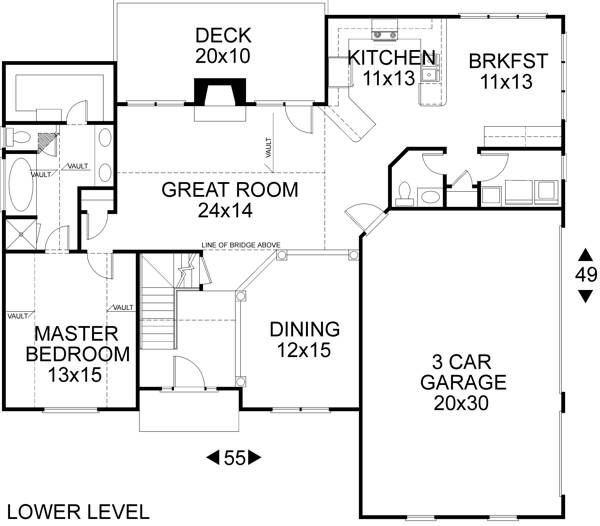 Just beyond the beveled glass front door with it's sidelights and transom lies an open foyer which vaults to 18'. To the right is an 12' x 15' dining room with a 4" raised floor surrounded by decorative columns. Just beyond the "bridge" is the 24' x 14' great room with a fireplace centered between two french door units with radius windows above. The master suite vaults to 12' and is brightened by a 6' "Palladian" window. It includes a full-featured vaulted bath and a 6' x 11' closet. The open 11'x13' kitchen provides 2 breakfast bars serving both the breakfast and great rooms. The large breakfast area allows space for a recipe desk and additional cabinetry. There's also a spacious laundry room with a laundry tub. Lower level rooms which are not vaulted have 9' ceilings.