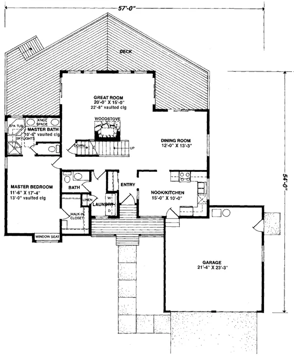 A scenic or sloping lot can be accommodated nicely with this wonderful walk-out design. Inside, the Great Room boasts an energy-efficient woodstove and two sets of sliding glass doors to the deck. Easy access from the kitchen to the garage saves steps when unloading groceries.