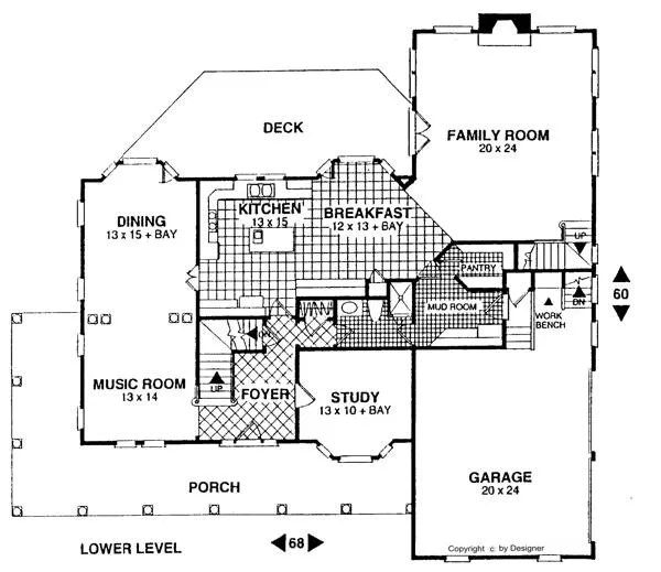 The eye-catching elevation is but a hint of the excitement you'll find in this dramatic new farm house design! The wrap-a-round porch awaits rocking chairs and a swing. The two story foyer provides an immediate feeling of spaciousness which characterizes this open and roomy floor plan. Highlights of the lower level include: A study, a music room, a large 13' by 15' dining room, a mud room, a large kitchen/breakfast room, a 20' by 24' family room with a vaulted ceiling and sky lights, and a large deck with multiple access.