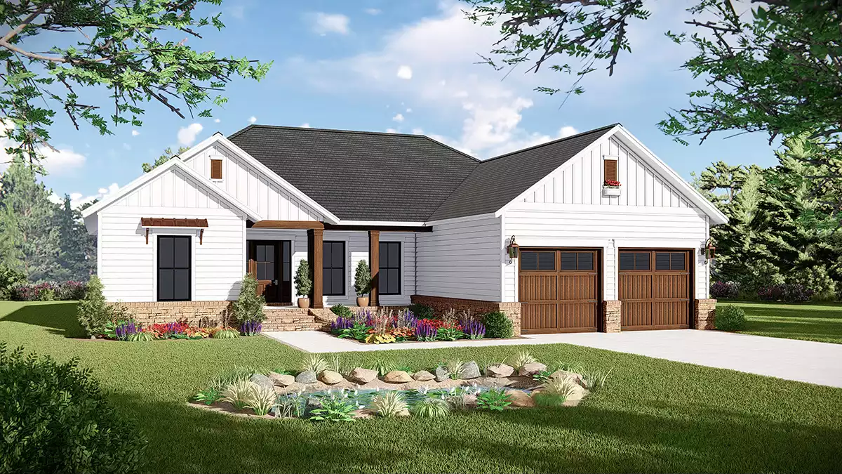 This new affordable charming one-story farmhouse features 1,600 square feet in a functional split 3 bedroom layout with an open living area. The vaulted kitchen with center island overlooks the deck, along with the casual dining room. The private master suite has a garden tub, dual vanities and is accessible to the laundry room. A two car front entry garage has an optional entry to a basement for added living space.