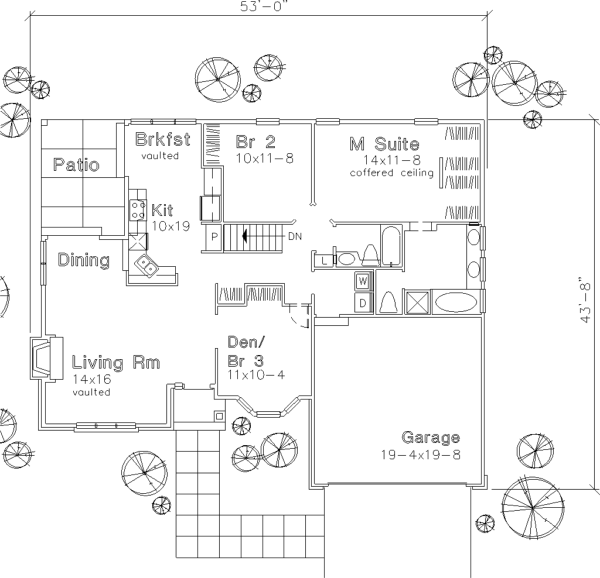 Soaring vaulted ceilings and terrific transom windows give a bright, airy feel to this attractive one-story home. The columned and sidelighted entry opens directly into the spacious living room, which features a fabulous fireplace. A 12-ft. vaulted ceiling embraces a tall, arched window. The sunny breakfast nook boasts a 10-ft. vaulted ceiling and patio access. His-and-hers walk-in closets and a private bath are showcased in the secluded master suite, which is further enhanced by a 9-ft.-high coffered ceiling. The master bath features high windows, an oval tub and a separate shower.