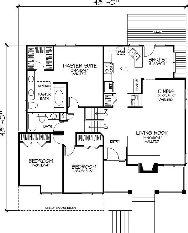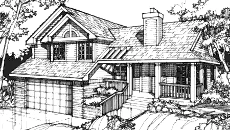 For a sloping lot, this four-level split design offers maximum value and versatility. A covered front porch with arbor detail adds streetscape interest. The interior feels spacious with vaulted ceilings, flowing spaces and long views through corner windows. The master suite boasts a vaulted ceiling, a plant shelf, a walk-in closet and a private skylighted bath.