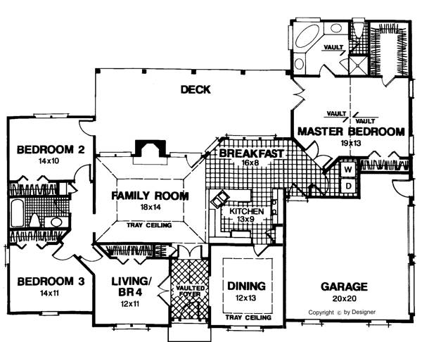 This sprawling 66'x49' ranch design features 1,886 sq. ft. of living space. Taking advantage of angled entries enables this innovative plan to offer four bedrooms. Joining the family room and breakfast room makes it possible for creative decorating. The sunny kitchen and breakfast room overlook the spacious outdoor deck. Dramatic tray ceilings are "custom" features in the family and dining rooms. The master suite also takes advantage of an angled entry and a vaulted ceiling. A large walk-in closet as well as an additional closet provide an abundance of closet space. Amenities usually found in much larger homes, such as separate garden tub and shower, abound in the master bath. A laundry room is conveniently located off the kitchen/breakfast area.
