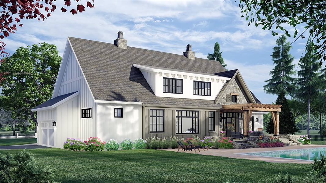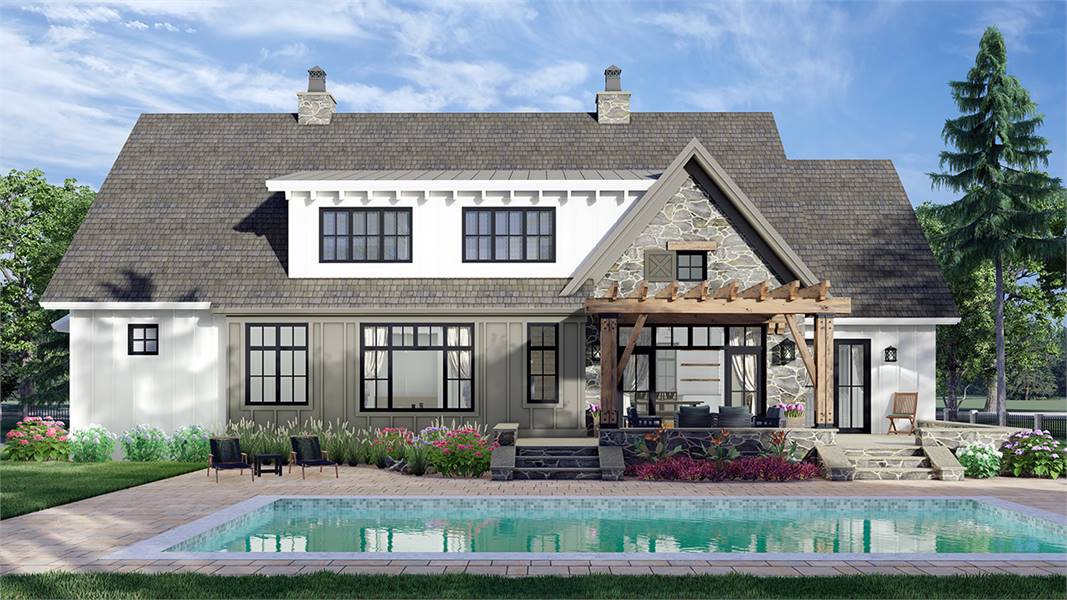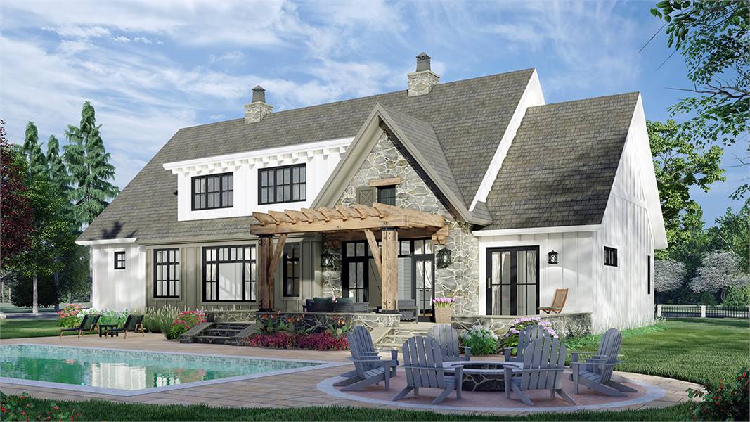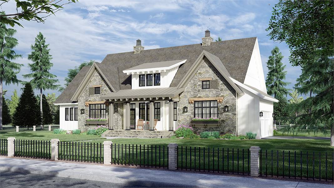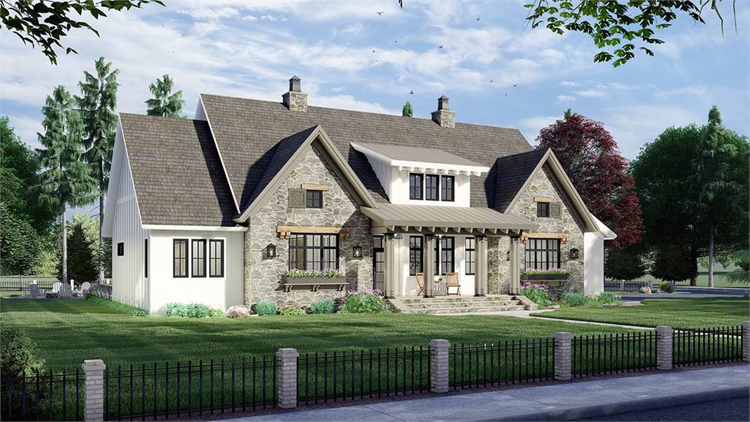 An eye-catching facade and a spacious 2,655 square foot layout are only the beginning of what this marvelous farmhouse plan has to offer. Featuring a brilliant fusion of rustic and modern charm, this 2-story family plan has so much to offer. And with its 4 bedrooms and 3.5 bathrooms, the design is perfect for a new or growing family. Beyond the covered front porch, flanked by large windows, enter into the foyer as the journey begins. Discover the capabilities of areas like the massive island kitchen and the cozy family room and nearby covered deck. Enjoy bonus features such as the butler's pantry and prep kitchen as well as a nearby guest suite. And speaking of suites, be sure to check out the master, complete with a split walk-in closet and even its own coffee bar to help make waking up a bit easier in the mornings! Upstairs houses the two other bedroom suites, along with a homework area that is perfect for the kids. There is even a laundry chute to ease the pains of collecting weekend laundry!