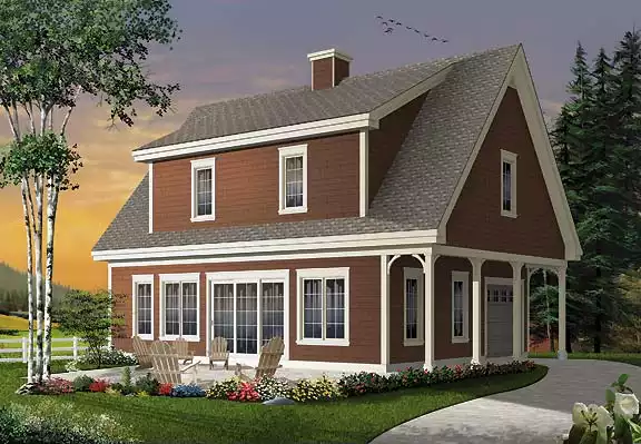 A modest and understated 3-bedroom home, this cottage style plan has lots to love about it. Providing you with 1,536 square feet, this plan is not only affordable, but it is a great option as a lake or mountain house, complete with plenty of areas to soak in the views. A single garage begins the main level and provides entry in to this lovely home. A coat closet and powder room are conveniently located downstairs for the comfort of guests. An open concept living room and dining room join with the L-shaped kitchen and eat-in island to create a natural flow and large space for the family to enjoy together. Sliding glass doors provide easy access to the backyard and are great for keeping an eye on the kids as they play outside. The second level of this home finds 2 secondary bedrooms and a shared full hallway bathroom, as well as the master suite, complete with walk-in closet and a spectacular bathroom featuring a massive walk-in shower and spa-tub. Every bit of this home is focused on escaping in to relaxation and getting away from the hustle and bustle of everyday life. Consider treating yourself to an affordable and attractive vacation home that is this versatile plan.