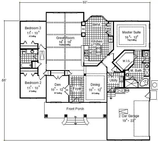 This tasteful one-story home design offers a certain understated elegance. The first things you notice are the large windows and beautiful front porch, which beckon you to just sit on an old porch swing and enjoy the day. As you enter the home, the foyer leads guests past the den and the dining room and into the 300+ square foot Great Room where the family can gather. The roomy kitchen with island cooktop serves both the dining room and the bayed breakfast nook, with views to the backyard. Private spaces start with the master suite, with its impressive tray ceiling and enormous walk-in closet. A garden tub, his and hers vanities and walk-in shower complete the suite. Secondary bedrooms are sized nicely for your growing family.