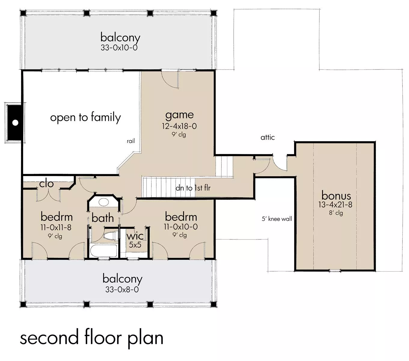 Verandas and balconies seem to offer a country welcome when visitors arrive at this farmhouse house plan, with 2,458 square feet of living space, and three bedrooms and 2.5 baths. A fireplace warms the sizable family room in this home plan, which flows into the versatile dining room. The family chef will appreciate the fabulous kitchen, with its bright nook and handy pantry. Don't forget the option of serving some meals on the rear veranda. Enjoy some relaxation in the vaulted master suite of this home design. The private bath boasts a garden tub, a separate shower and a dual-sink vanity. Two walk-in closets keep your clothes organized. Upstairs, two bedrooms share a split bath. Kids will love the fabulous game room, with access to the rear balcony. A bonus room above the garage adds 340 sq. ft., and would make a nice playroom. Builders point out the study on the first level; how about using it as a den or reading nook?
