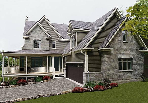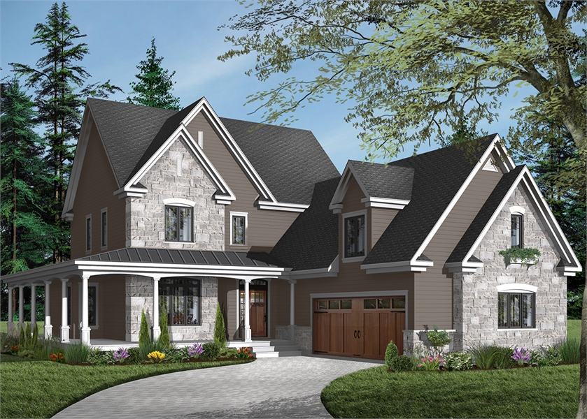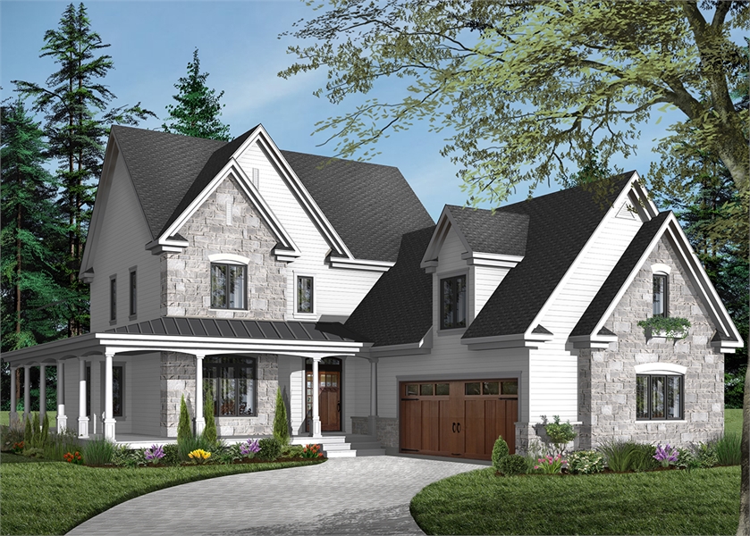 A captivating front façade draws you in to this wonderful country-style plan. Boasting 2 stories and 2,376 square feet, this home is bursting with the charming personality and functional space. An immense wraparound porch adorns the front of the home and spans an entire side of the plan, perfect for enjoying a beautiful summer’s day or watching the sun set with friends and family. Upon entering the front door, you are greeted by a sprawling grand foyer, as well as a half bathroom that is well-suited for guests. From there, you move past an office space that is centered around productivity and privacy, and in to the family room and kitchen space. An open layout helps the rooms of this home to flow together in a natural way that makes this great space feel even larger. An amazing kitchen island comes complete with bar top seating for 4, as well as space for a more formal dining table. Off of the dining space is an additional access to the wraparound porch, making entertaining guests both inside and outside a breeze. A 3-car garage and a mudroom/laundry room makes chores easy and accessible. Moving to the second floor, you will find 4 bedrooms, including the master suite, and 2 bathrooms. Three of the auxiliary bedrooms share a bathroom, while the master suite has its own. Each bedroom has its own large closet, making storage a non-issue. The master suite comes complete with a large walk-in closet, as well as a beautiful walk-in shower and separate spa tub. A toilet tucked away in a water closet creates privacy. All of this space is not only multi-functional, but it allows this home to suit any size family while growing alongside them.