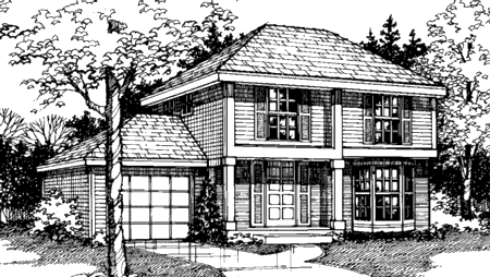 This compact and efficient design is perfect for the first-time home builder. The main floor provides an open, spacious living room for family activities or formal entertaining. The attached dining room opens to a lovely patio and is easily serviced by the modern U-shaped kitchen. A convenient half-bath and the garage entrance are nearby. Upstairs, double doors open to the handsome master bedroom, where the ceiling vaults to a flat area of 9 feet. The adjoining full bath can be entered from the master bedroom or from the hall. The garage may be omitted for a narrow lot, or expanded to accommodate a second car.