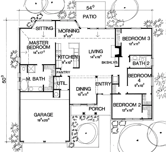 This very efficient four bedroom home design has under 1750 sf of framed heated area. The remote master suite and open floor plan are popular features. The kitchen has a serving counter to the living room and there is a formal dining room also.
