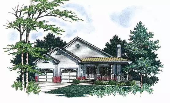 This small plan is packed with first class features. A sprawling wrap around porch sets a relaxing mood for the homeowner. An immediate feeling of elegance greets visitors as they enter the home. The great room is embellished with a tray ceiling and only columns are at the juncture of the great room and dining room. Enhancing the ambiance, the dining room includes a china cabinet alcove and built in shelves for display or storage. The organized kitchen includes a center island for ease in meal preparation. The snack bar offers an alternative to sitting at the table, and convenience in serving. The kitchen is linked with the outdoors through a door leading to a sequestered patio. Double garage access is also from the kitchen. Thoughtful touches add excitement to this popular plan suitable for any setting. One touch is the airy, restful master suite. The volume tray ceiling adds height. The garden bath includes a well-placed tub and double vanity. An outstanding walk-in closet is nearby. The other two bedrooms include ample space to be either family bedrooms or guest rooms. One includes a walk-in closet and a hall bath is situated adjacent to both. A full laundry room is near both the bedrooms and the kitchen. It includes a complete wall of cabinet storage. This affordable house has finesse inside and out. The nostalgic exterior appeal includes multiple gable roof lines and a standing seam metal roof over the porch.