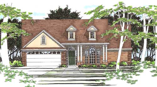 A quaint country style home, this traditional plan is full of southern charm. A columned front porch matched with dormers and ornate windows gives this house a welcoming and inviting feeling. Once past the front door and 2-car garage, this plan provides an efficient layout of 1,385 square feet, including 3 bathrooms and 2 bathrooms. A brief foyer provides access to a formal dining room bathed in sunlight thanks to a forward facing window.  A nearby utility closet and large walk-in pantry provide ample storage, while an open layout flows in to the combined living room and nook area. A fireplace and eat-in kitchen complete the main living area, as well as provide outdoor access to the rear patio. Off of the kitchen and nook you will find the master suite. A large bedroom and dual master closets join with a relaxing spa bathroom to make a great space focused on you. The opposite end of the home finds two additional bedrooms as well as a shared full bathroom, a great option for kids and/or a home office. A reduced footprint to this plan makes it a great option to build on virtually any lot and with practically any budget.