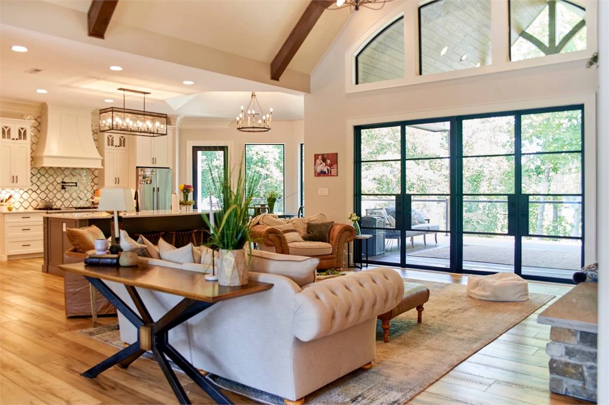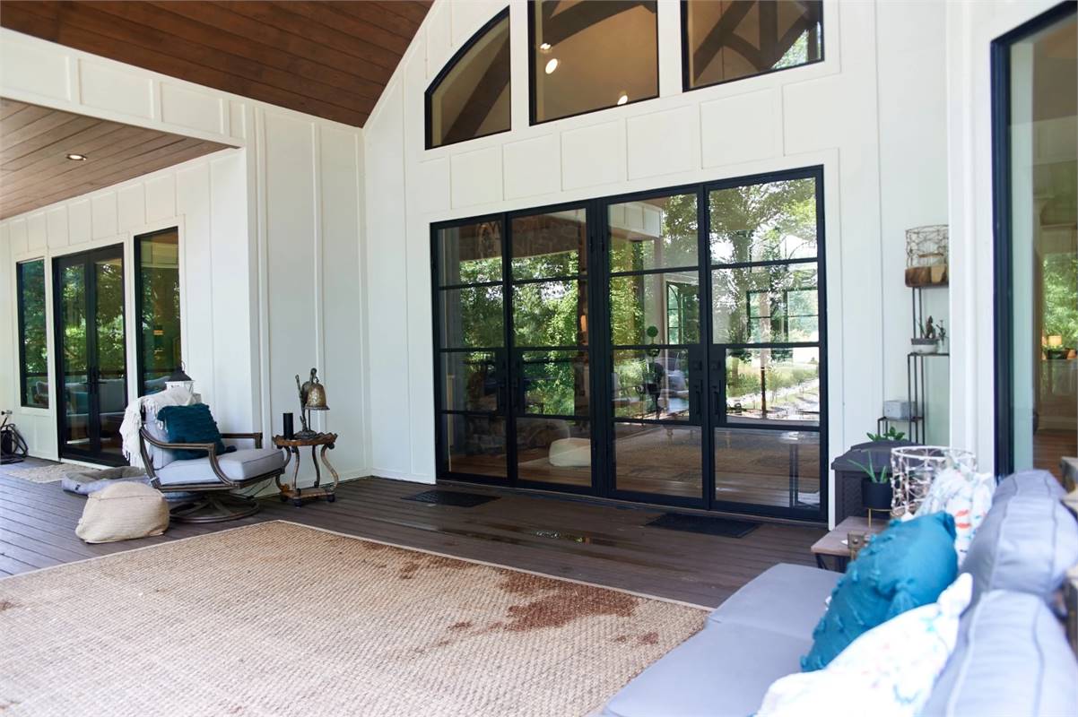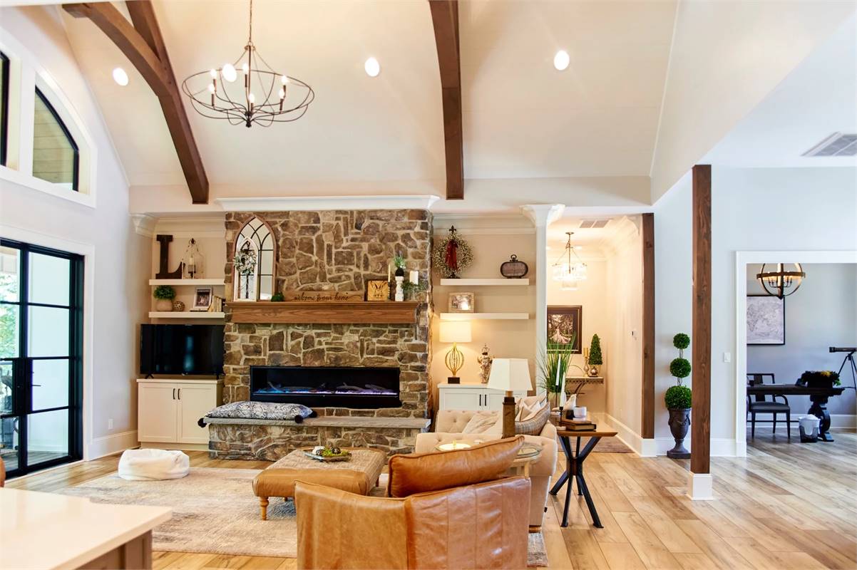 The open concept main living area, aptly referred to as the “lodge room,” is combined with the large kitchen that has a copious amount of countertop and cabinet spaces. The breakfast nook will be bathed in natural light and the access to the back patio areas is convenient for bbq weekends. Two sets of double doors lead out to the vaulted covered deck that has a fireplace perfect for smores on chilly winter nights.