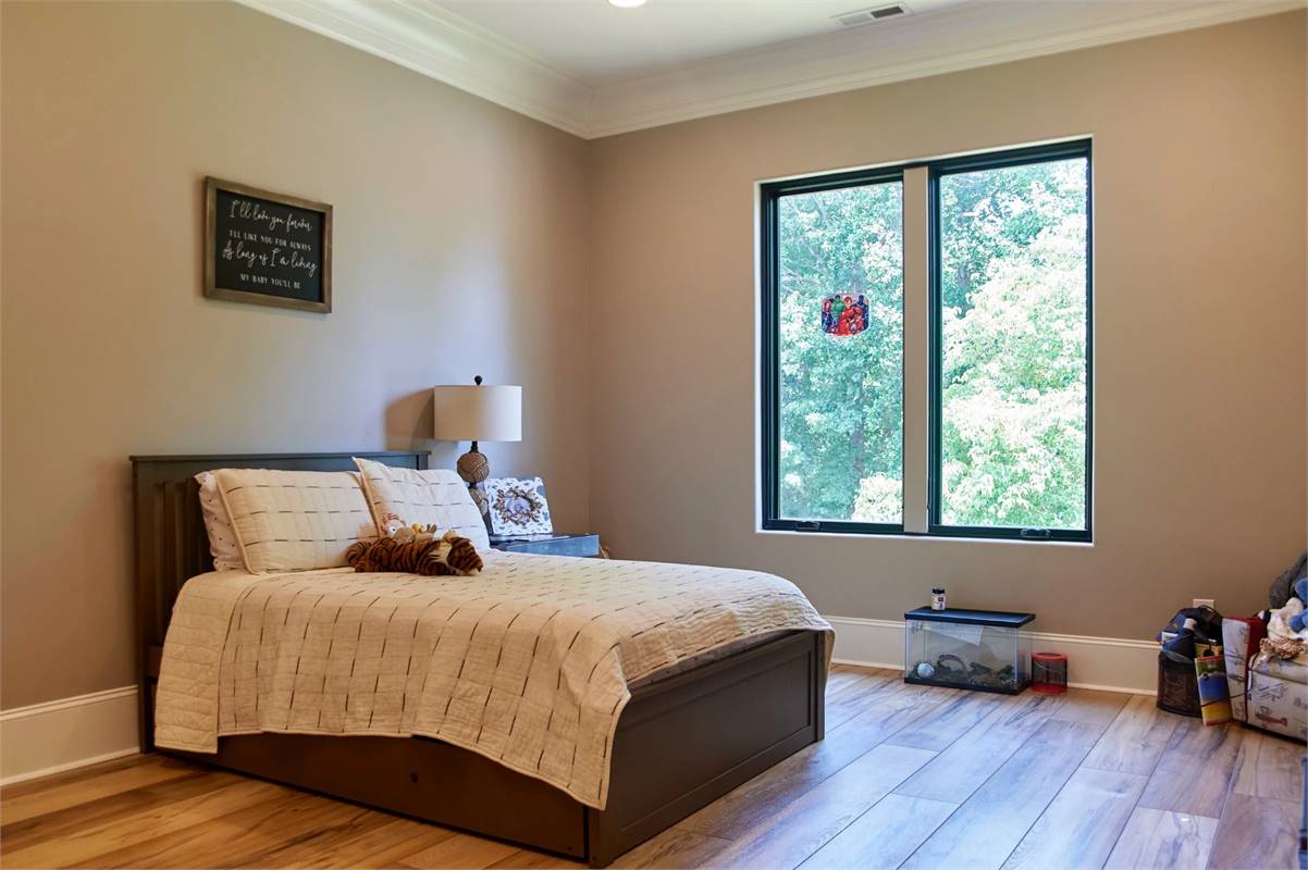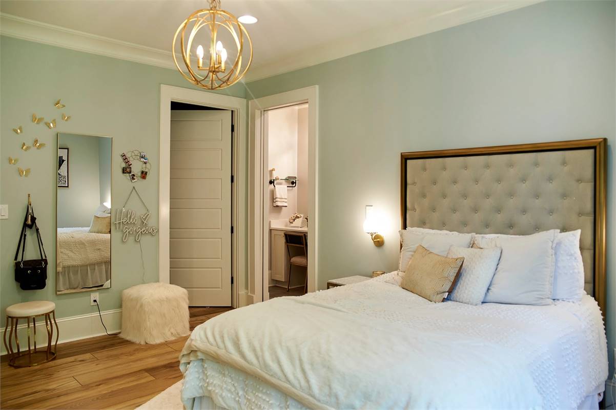 The family’s garage entrance feeds directly into the mudroom helping with organization. The clever door placements allow ease for unloading groceries into the large pantry as well as a drop-off zone for dirty weekend sports uniforms. Both secondary bedrooms are found on the left side of the home and each have their own full shower bathroom and walk-in closets.