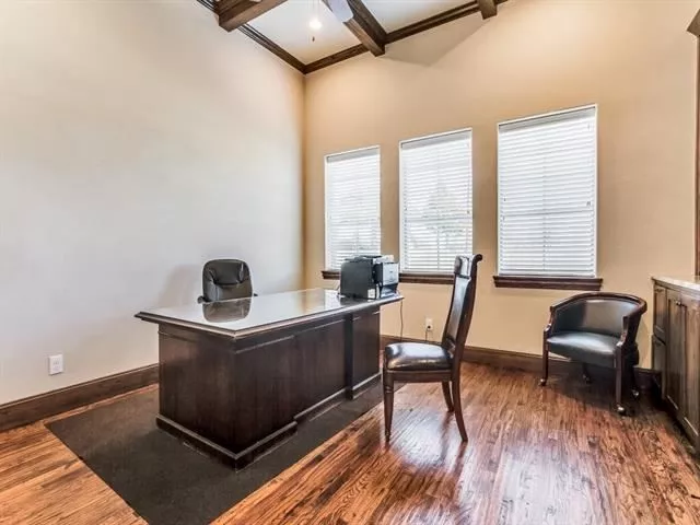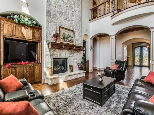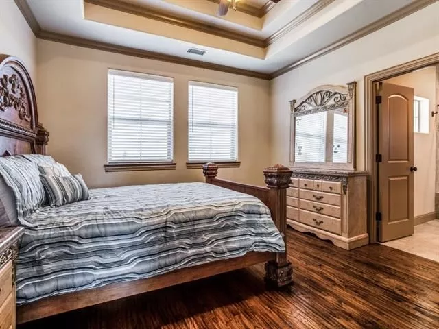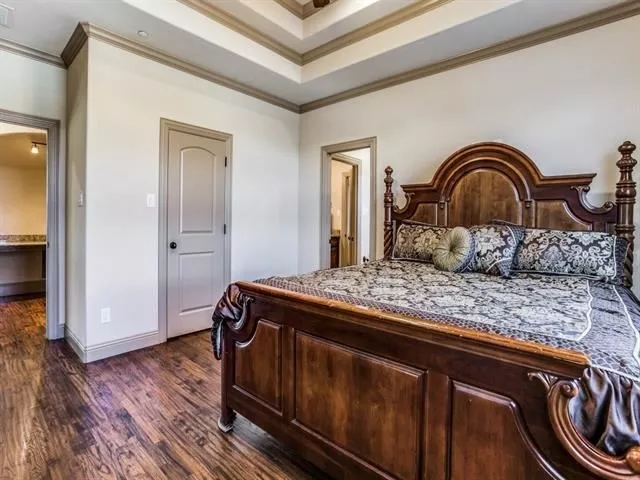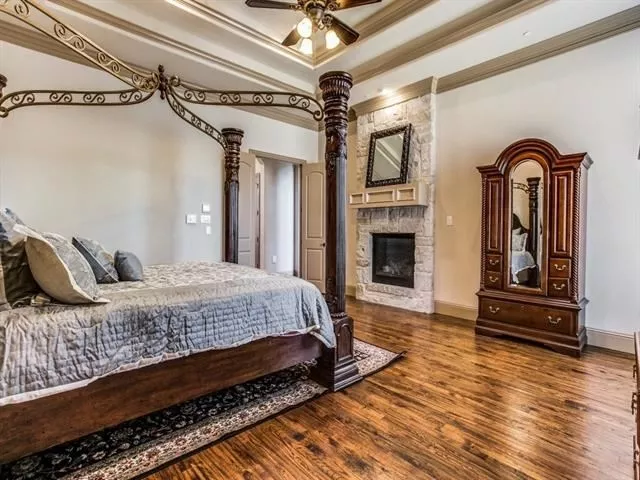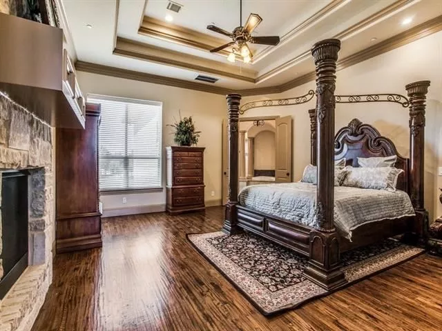 magnificent master suite, compete with a 14-foot triple trey ceiling, warming fireplace, and luxurious master